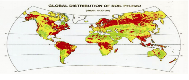 Dünyanın (0-30 cm) yüzey toprağına ait pH haritası; kırmızı kısımlar pH<=5,5 (Asidik) sarı kısımlar pH 5,5-7,3 (Az asidik ve nötral) aralığını yeşil kısımlar ise pH>7,3 yani bazik toprakları gösteriyor. Kalkerli-kireçli topraklar yeşil olarak gösterilmektedir.