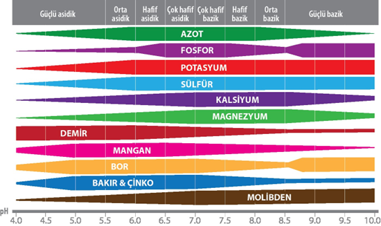 Bitkilerin besin elementlerinin alınabilirliğine dair pH değerlerini gösterir şemada aşağıda verilmiştir.