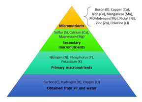 Aşağıda Amerika Birleşik Devletleri’ndeki Minesota Üniversitesi bitki gübreleme rehberi olarak verilen Bitki Besleme Piramidinde görüleceği üzere: Birincil Makrobesinleri olarak kabul edilen Azot (N), Fosfor (P) ve Potasyum (K) elementlerine diğer besin maddelerinden daha fazla miktarda ihtiyaç duyulur. İkincil makro besinler arasında sülfür (S), kalsiyum (Ca) ve magnezyum (Mg) miktarsal olarak bulunur.